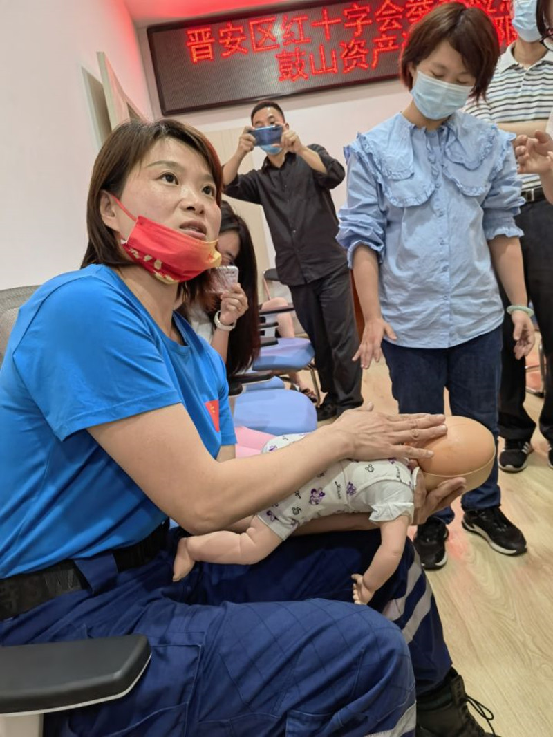 理論講解結(jié)束,再利用急救模型道具,現(xiàn)場示范模擬心肺復蘇、人工呼吸、AED操作步驟、海姆立克急救法等操作流程,理論與實踐相結(jié)合,讓大家能夠更好地理解并掌握急救要領(lǐng)。
